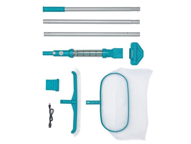 • В комплект поставки входят: телескопическая 3х секционная ручка, беспроводной аккумуляторный пылесос AquaSurge 58771 (две насадки), щетка-насадка AquaBroom 58280, сачок-насадка AquaNet 58278;